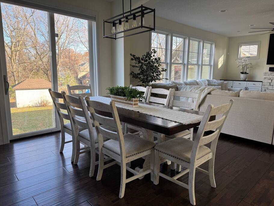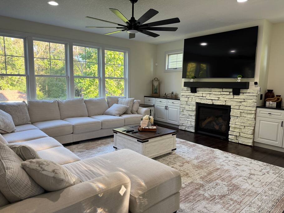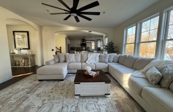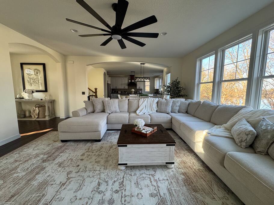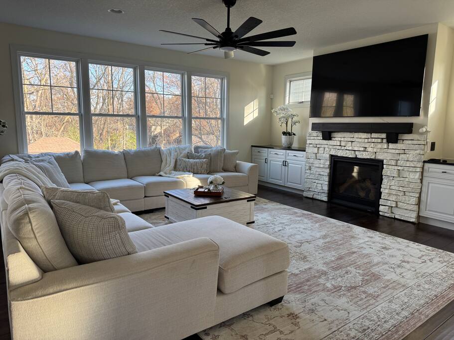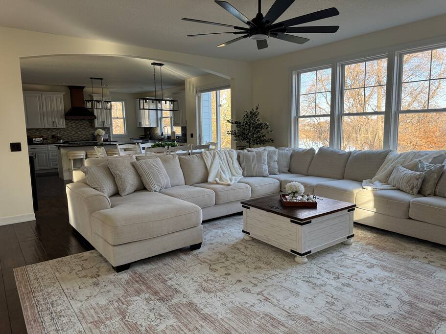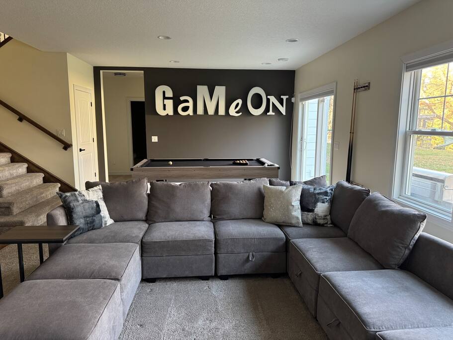 A bright and spacious living area greets you near the entryway, designed for comfort and connection. Large windows bring in plenty of natural light, and the open layout makes it perfect for group gatherings, movie nights, or relaxed conversations after a day exploring Maple Grove.