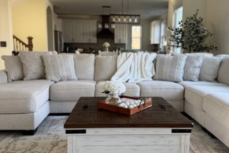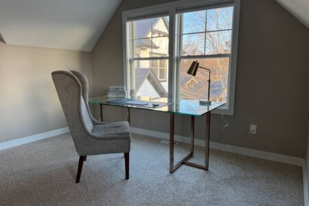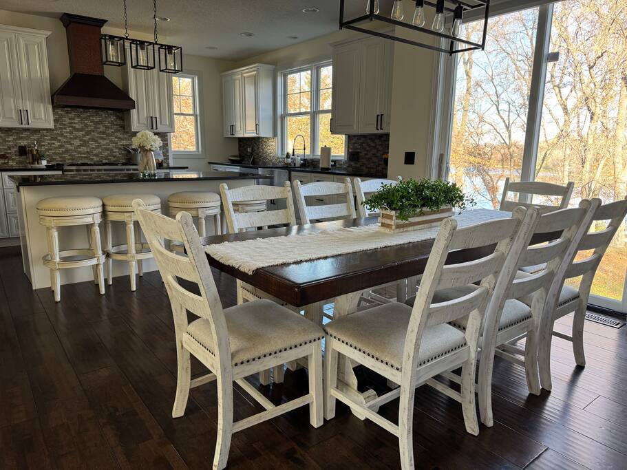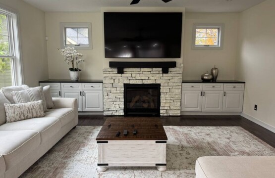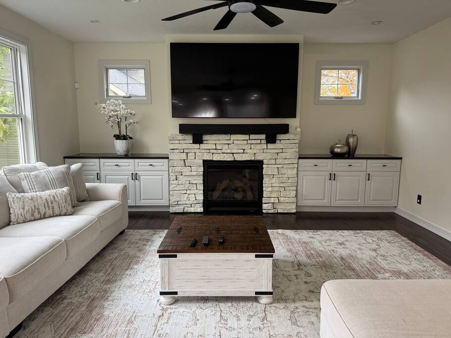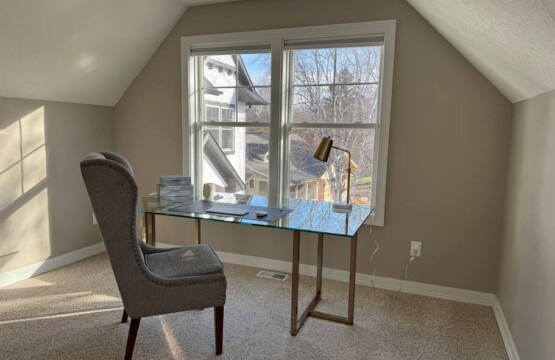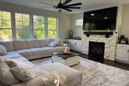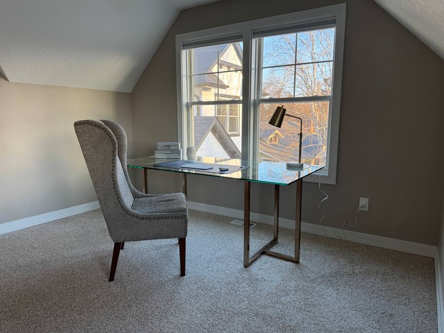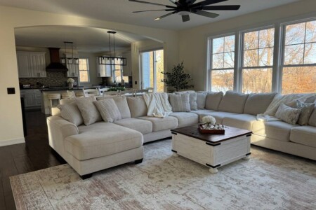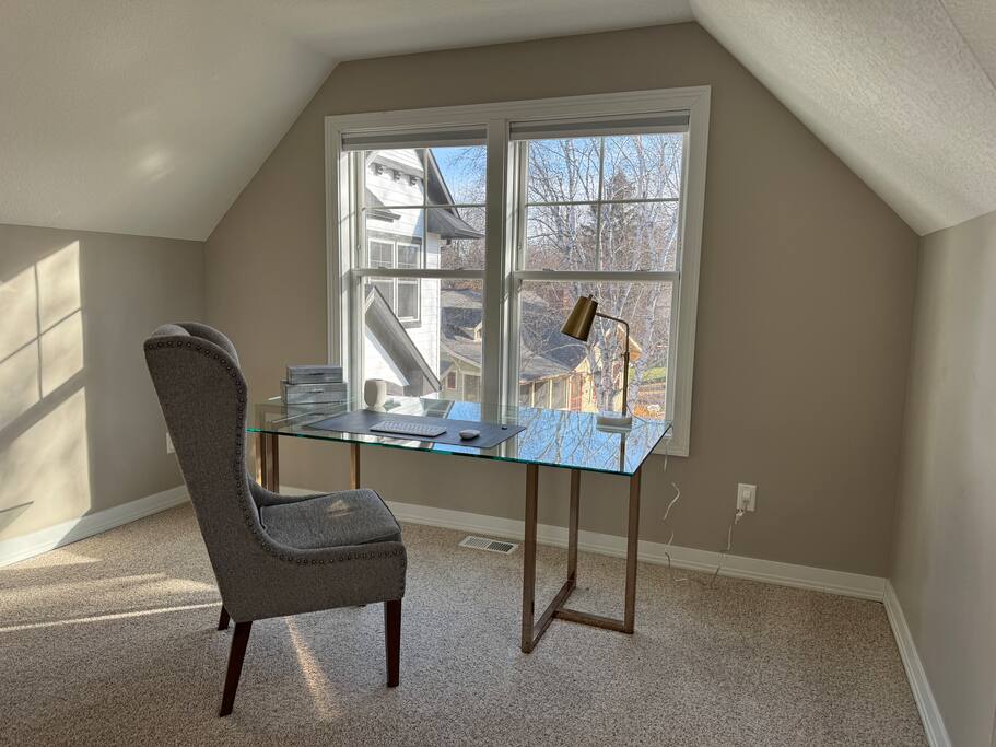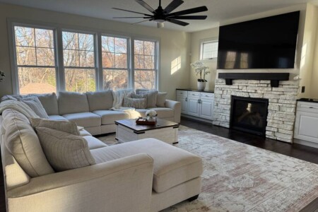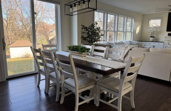 A bright and spacious living area greets you near the entryway, designed for comfort and connection. Large windows bring in plenty of natural light, and the open layout makes it perfect for group gatherings, movie nights, or relaxed conversations after a day exploring Maple Grove.