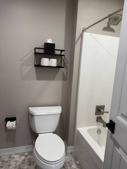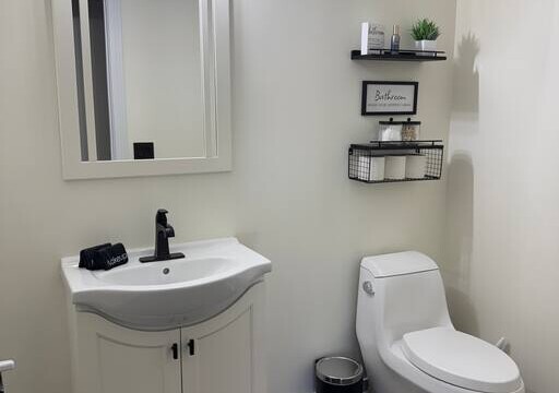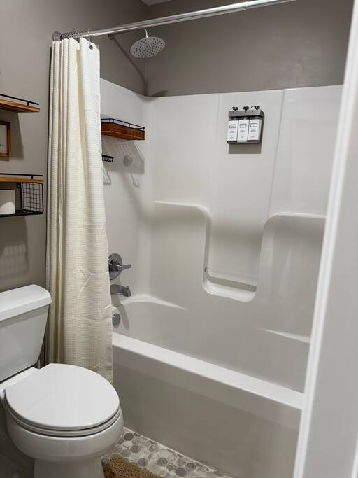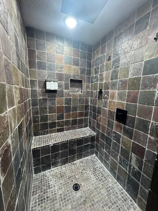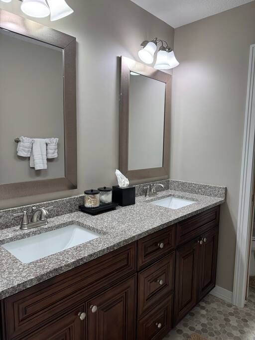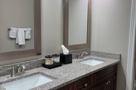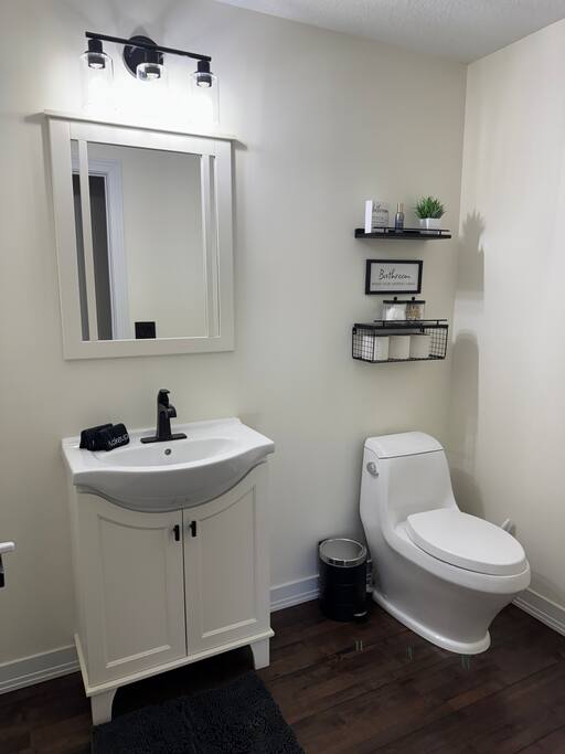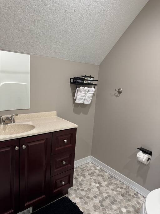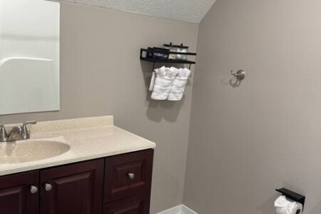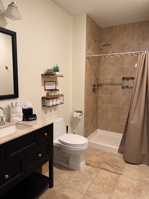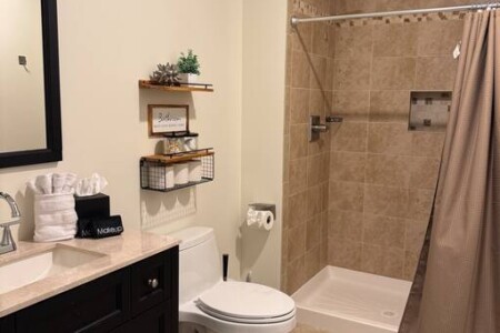 Modern and convenient, featuring a walk-in shower, vanity, and all essentials for freshening up after a fun game night or a busy day out.