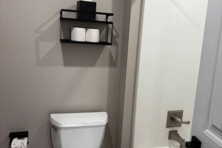 A stylish and convenient bathroom located off the main living area — perfect for guests or quick refreshes during the day.