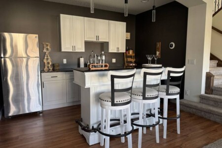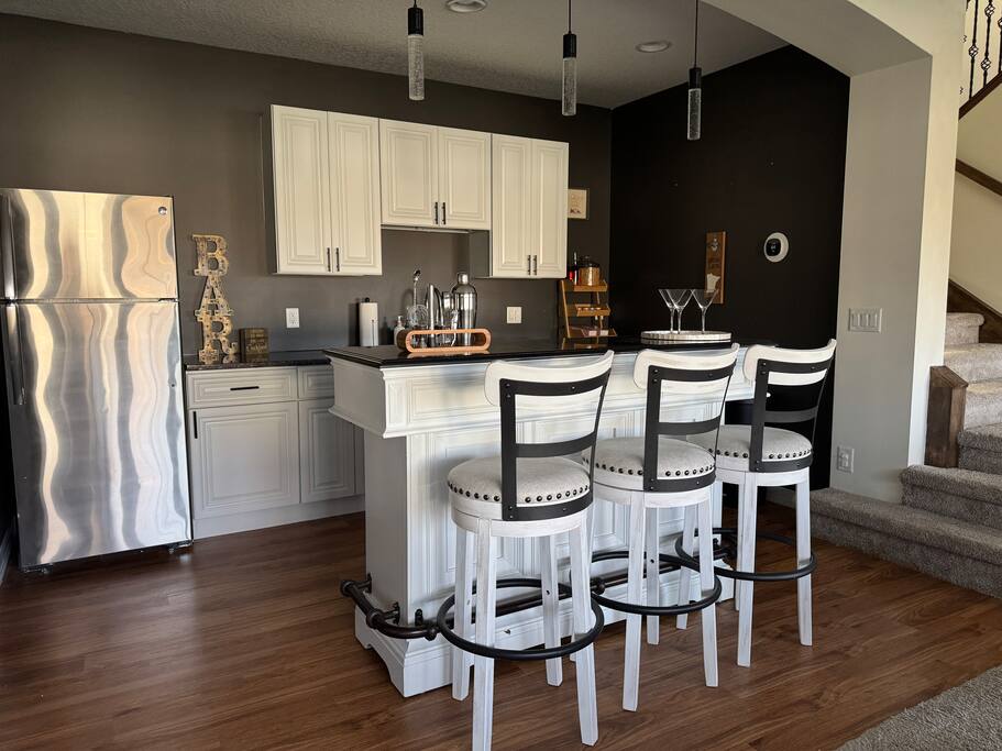 *Basement recreation room with wet bar, full-size fridge, pool table, and popcorn machine
