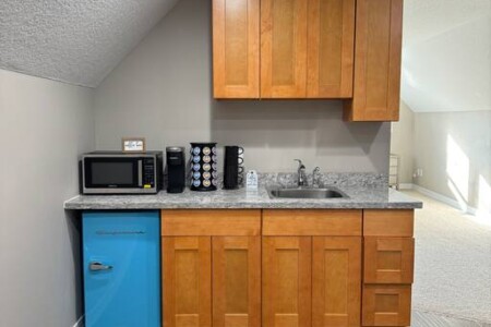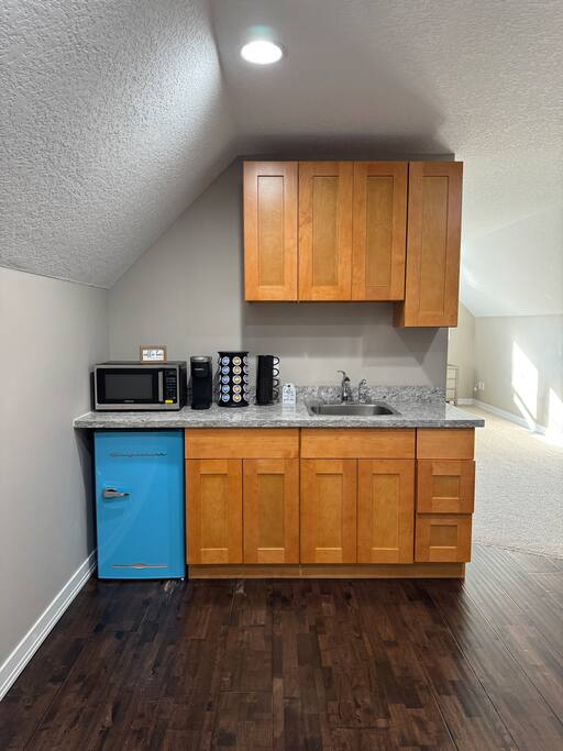 Ideal for longer stays or visiting couples, this suite includes a king bed, private kitchenette (mini fridge, Keurig coffee maker, microwave), desk/workspace, and an en-suite bathroom with a bathtub and walk-in shower.