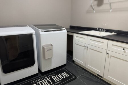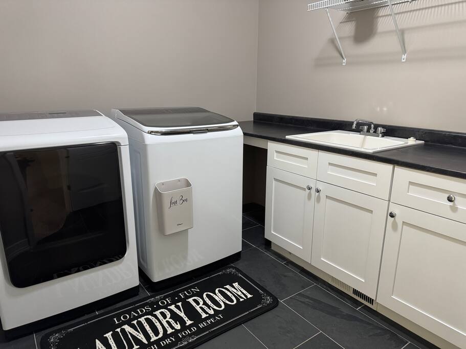 A full laundry setup with washer, dryer, ironing essentials, and shelving. Conveniently located upstairs near bedrooms for easy access during your stay.
