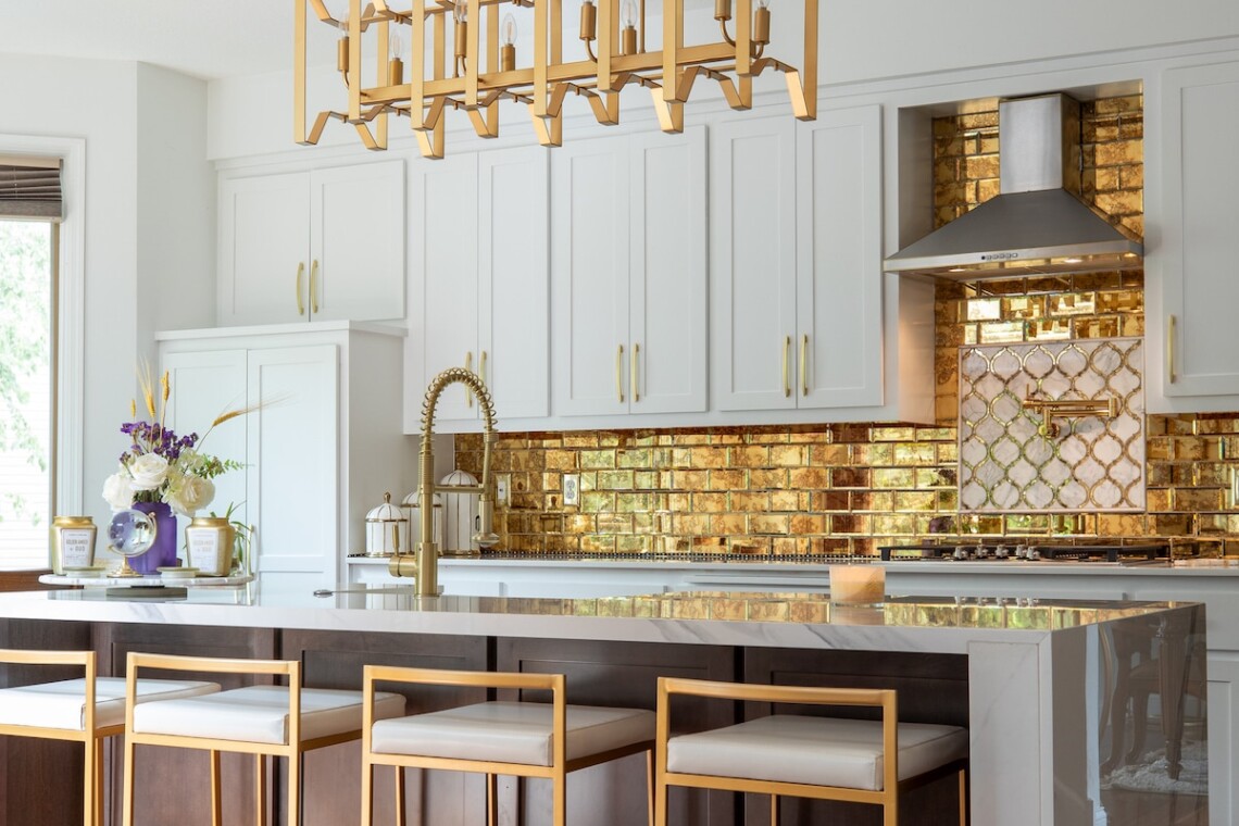 Stunning kitchen features a gold tiled backsplash and a waterfall countertop. It comes fully stocked with Samsung fridge freezer with built-in smart tablet, dishwasher, double ovens, gas cooktop and garbage disposal. We provide a coffee machine, kettle, toaster, blender, ample kitchenware such as measuring cups, mixing bowls, and a variety of utensils for all your cooking needs.