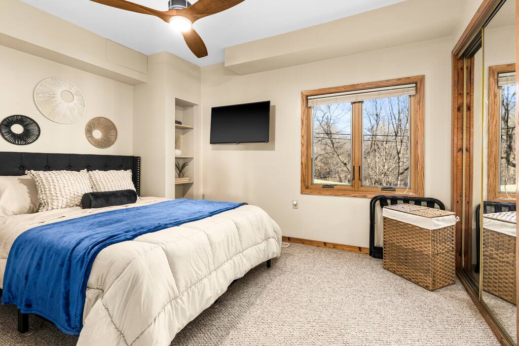 Bedroom 3: Retreat to this serene full-sized bedroom on the main level, where you’ll find all the comforts of home. Relax and unwind with a Smart TV, while the ceiling fan keeps the room cool. Convenient amenities like the suitcase jack, linen hamper, and ample closet space make your stay hassle-free. Wake up to breathtaking views of nature right outside your window.
